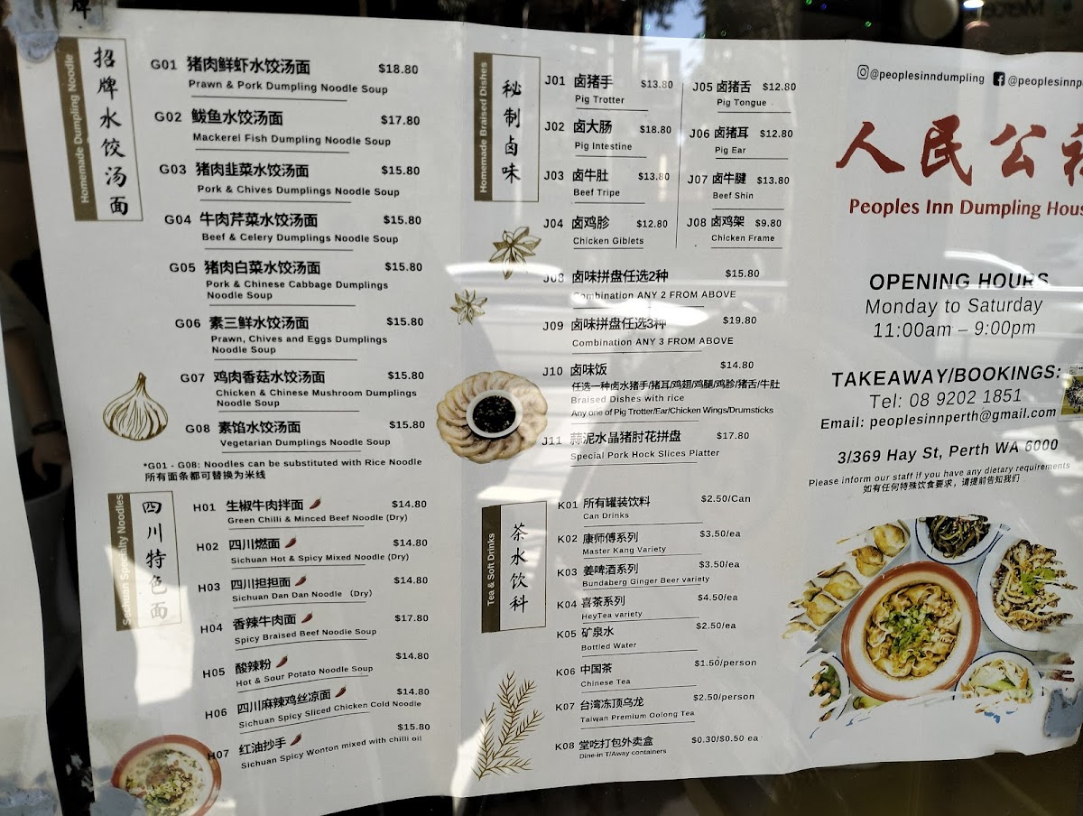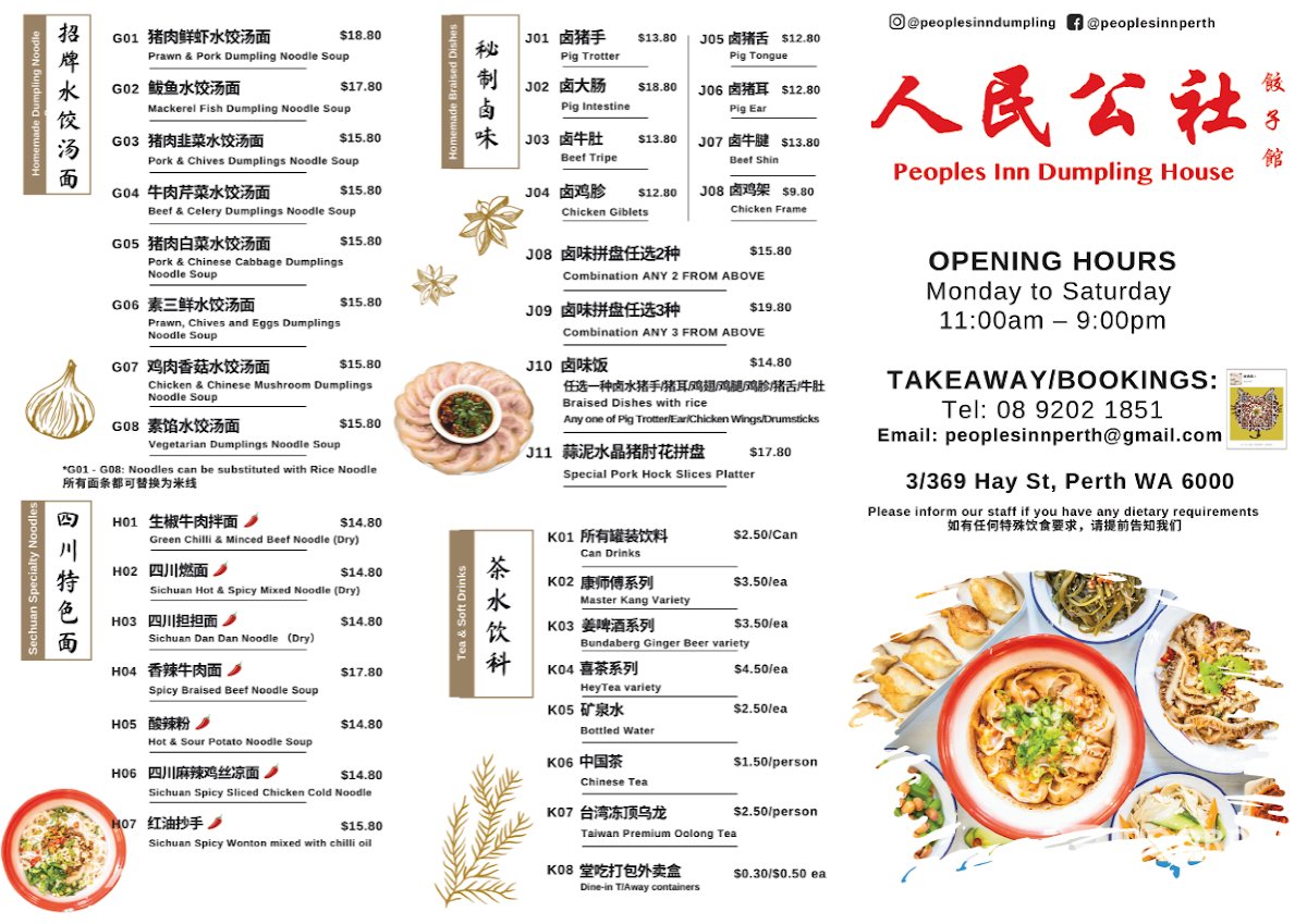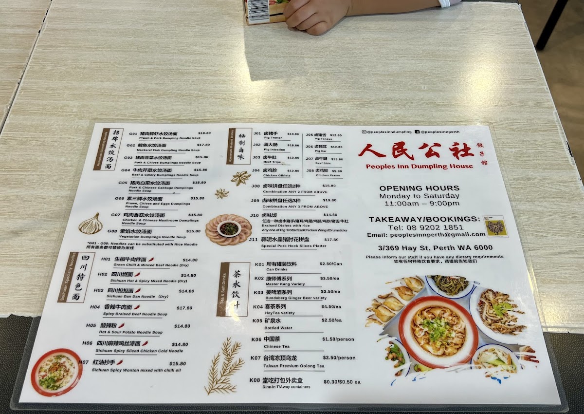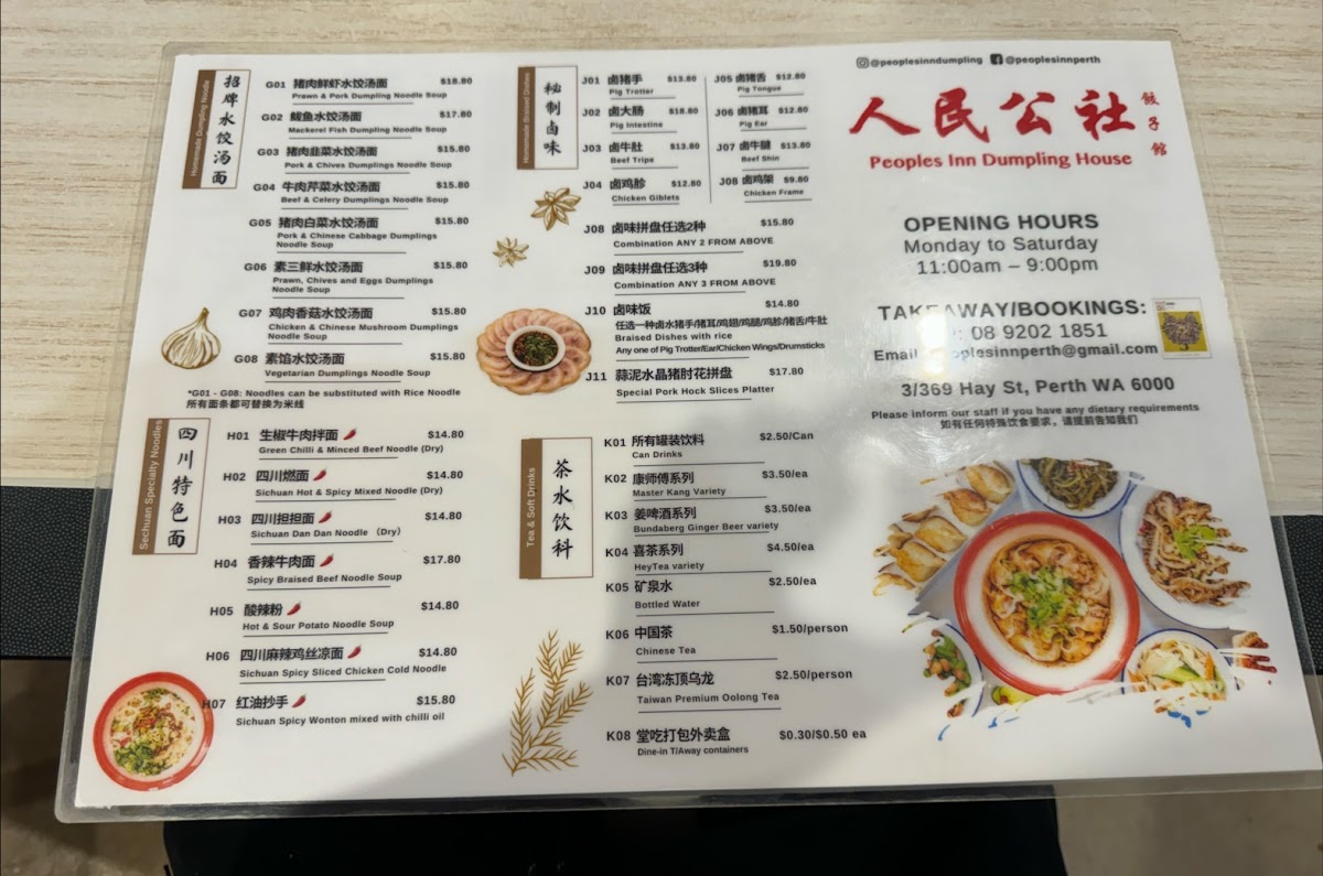 Welcome to Peoples Inn Dumpling House, where each dish is a celebration of traditional Chinese cuisine! Nestled at 3/369 Hay St, Perth WA 6000, our menu boasts an array of mouthwatering specialties that will tantalize your taste buds. Dive into our Spicy Braised Beef Noodle Soup, where spices dance harmoniously with tender beef, or savor our Pan Fried Pork & Cabbage Dumplings, perfectly crisp on the outside with a juicy filling. Don’t miss our Dan Dan Noodles, a beloved classic, or indulge in our delectable Pork and Prawn Dumplings for a burst of flavor in every bite. For something extra special, our Wonton in Chilli Oil and Sichuan Spicy Wonton Mixed with Chilli Oil are sure to excite those who love a kick! Pair your meal with a refreshing glass of freshly made Soy Milk or Deep Fried Chinese Dough Sticks for the perfect complement. Come explore the culinary treasures at our table, and let every dish take you on a delicious journey!